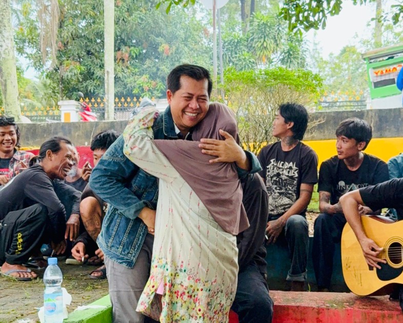 Padapada.id, Pangkalpinang – Sedang asyik bercengkerama dengan sekelompok musisi jalanan pada Minggu, 1 Juni 2025 sore, Basit Cinda terharu atas kehadiran seorang nenek dengan gendongan karung berisi barang bekas, yang datang menghampirinya. Tanpa ragu, tokoh muda karismatik ini menyambut si nenek yang mendekat lalu memeluknya, erat.